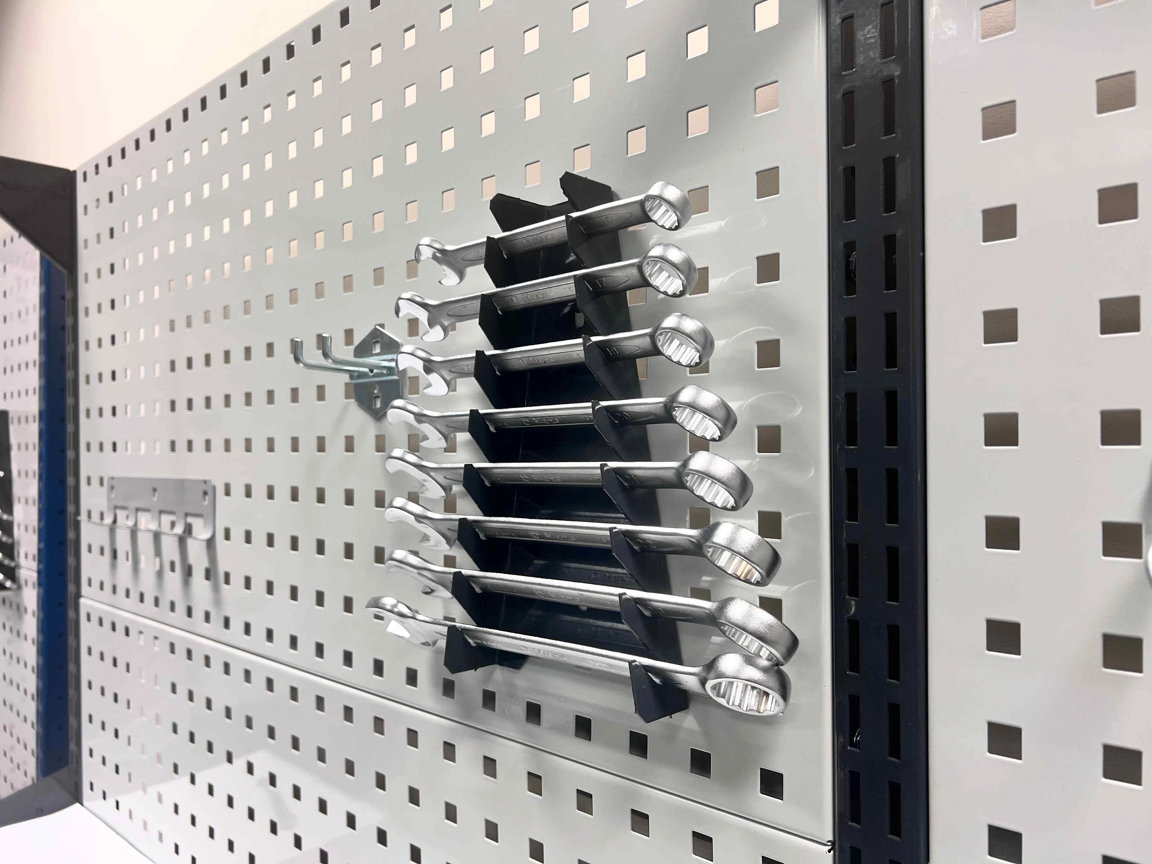 - Рабочее пространство становится более удобным за счёт разнообразных модулей с ящиками и тумбами, а также благодаря возможности установки одной или двух перфорированных панелей для хранения инструментов и навесных элементов.